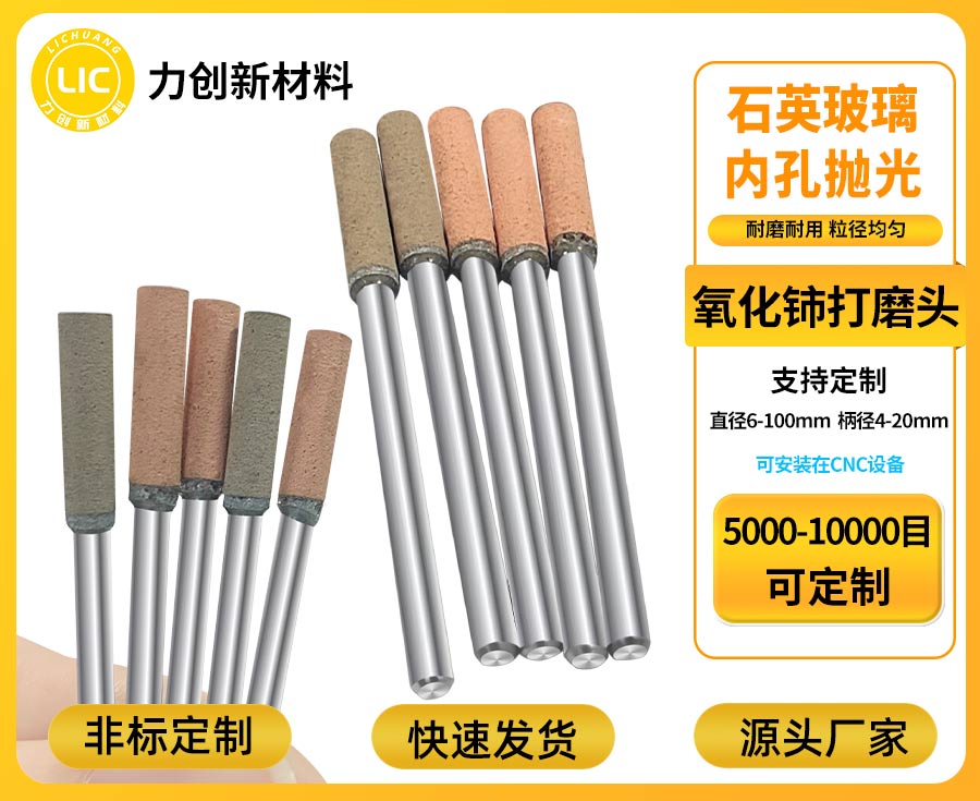 针对“不同玻璃材质抛光质量不稳定”的痛点,氧化铈打磨头通过精准的性能设计提供解决方案。其均匀的粒径分布,让磨料颗粒能与玻璃表面充分贴合:处理石英玻璃时,可有效去除高硬度材质上的顽固毛刺与刀纹;处理光学玻璃时,能实现平面与侧面的细腻抛亮,确保表面光洁度符合精密应用标准。这种对不同材质的适配能力,避免了企业为不同玻璃单独配置工具的麻烦,同时保障了各类产品的抛光质量一致性。 深圳市力创新材料科技有限公司的服务支持,进一步放大了氧化铈打磨头的实践价值。公司团队拥有13年相关行业管理经验,成员均来自大型磨料磨具知名生产企业,具备专业化制造能力,能从源头把控氧化铈打磨头的品质稳定性;服务过多家精密加工企业的经验,让团队可针对企业具体痛点,提供专用的抛光耗材应用方案,例如根据加工场景调整氧化铈打磨头的目数(5000-10000mm)与直径(3-80mm),实现按需定制。